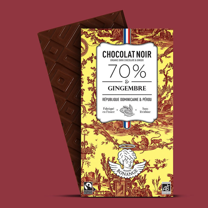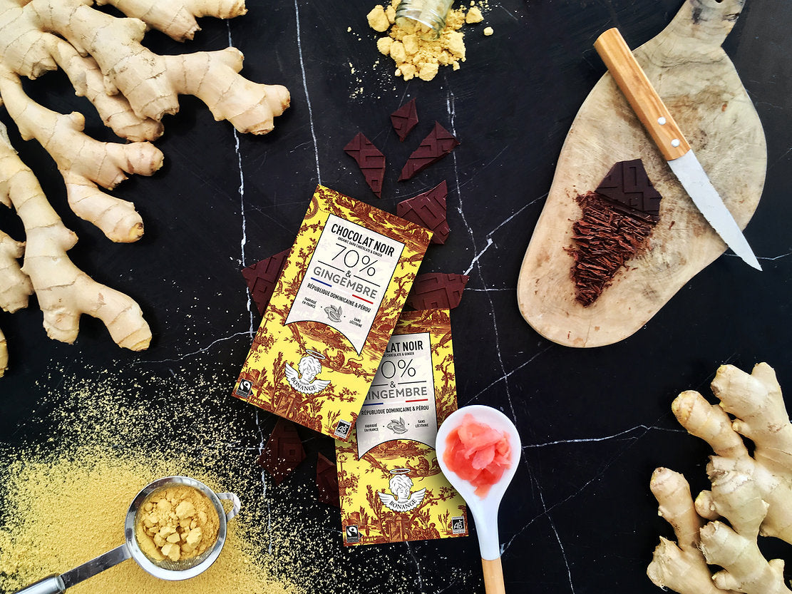Pour faire honneur à cette épice royale, laissez-vous surprendre par un savant mélange : La douceur et la générosité d’un chocolat 70% cacao et l’intensité des cristaux de gingembre.